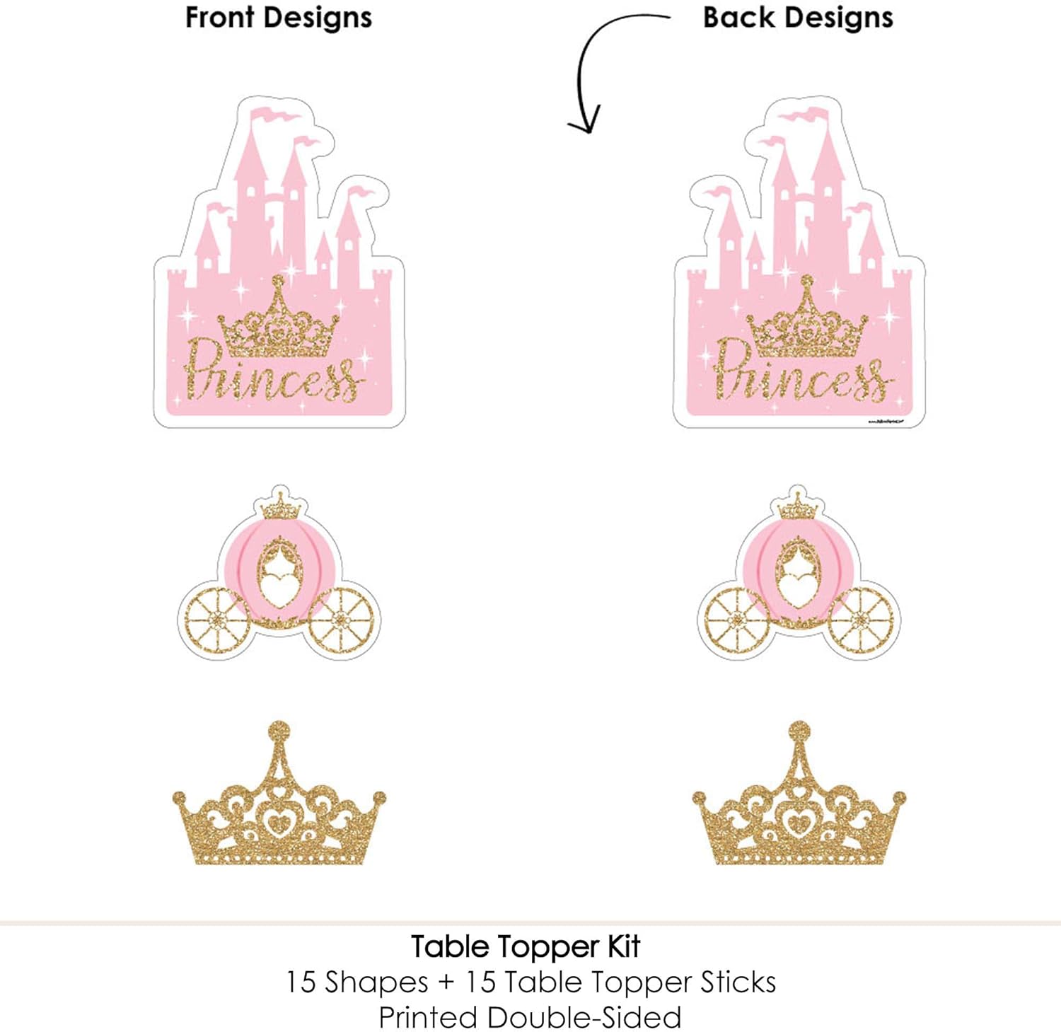 Bring your party theme to all areas of the celebration with Little Princess Crown - Pink and Gold Baby Shower or Birthday Party Table Toppers. Each heavy-duty cardstock paper cutout quickly attaches to the included table topper sticks to create centerpiece sticks that can be used in vases or floral arrangements at all your party tables. You can even add them to candy jars at your goodie table! Little Princess Crown - Pink and Gold centerpiece sticks may also be used as photo booth props. You will love how versatile this fun party supply is while your guests will adore seeing them throughout your party venue. Get creative with this set of 15 table toppers and have the truly YOU-nique celebration.
