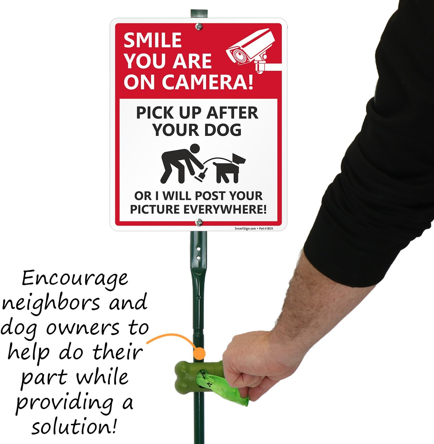 SmartSign Smile You Are On Camera! Pick Up After Your Dog Yard Sign & Clip-On Preloaded Dispenser Combo / Kit with 135 Dog Poop Waste Bags, 10"x12" Rust-proof Aluminum Sign with 3ft Steel Stake