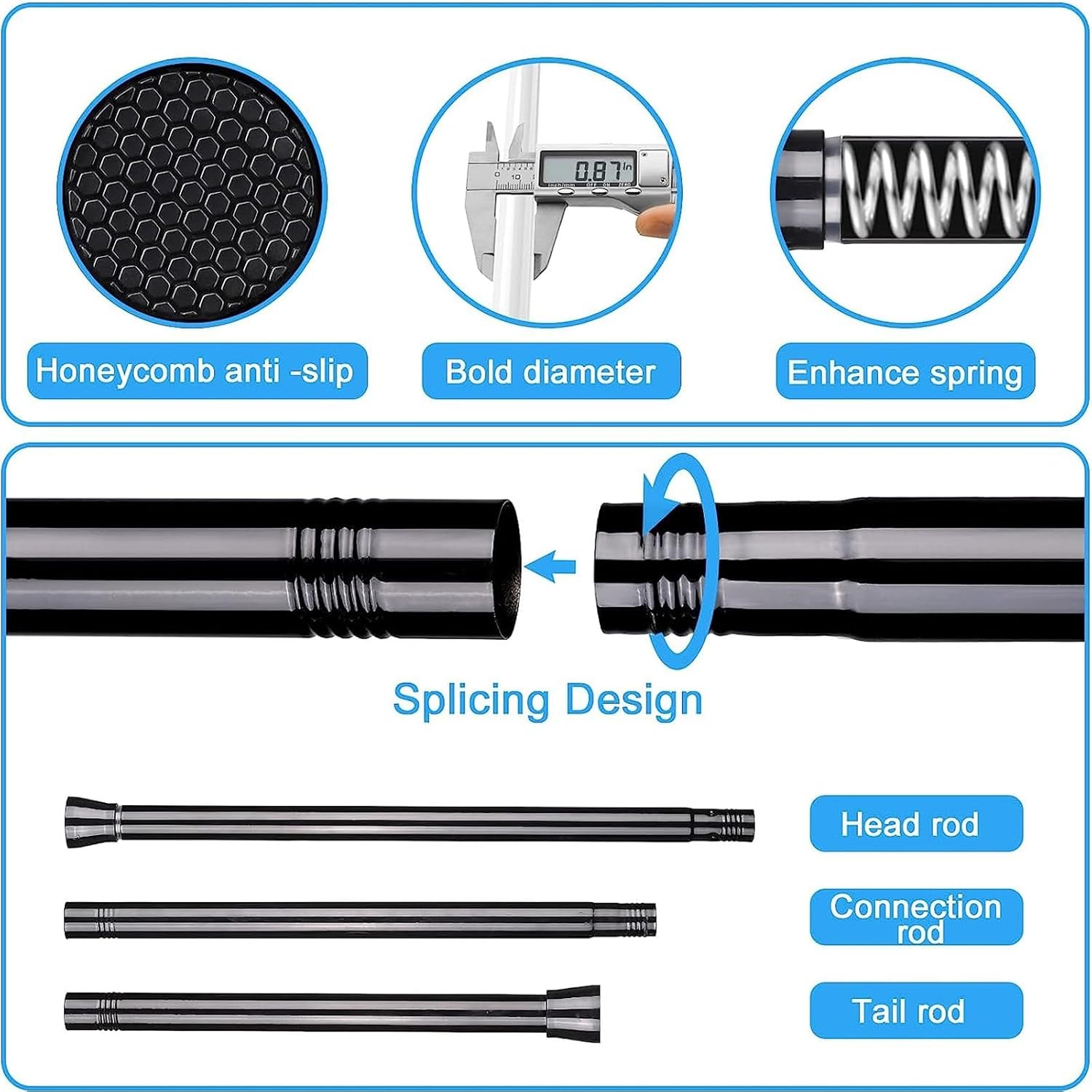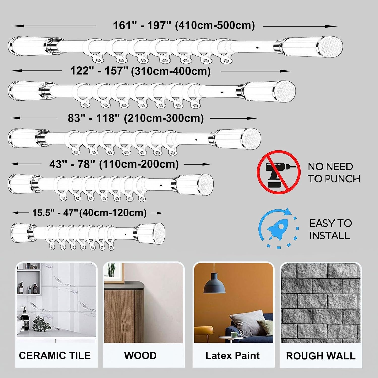 Upgrade your home decor with our Non-Porous Telescopic Curtain Rod and enjoy the perfect blend of style, functionality, and peace of mind. Transform any space effortlessly and experience the satisfaction of a well-designed and reliable curtain rod. Material: Stainless Steel Mounting Type: Tension Mounted Maximum load: 100 lbs / 80kg Color: White , Black , Gray , Green , Pink , Stainless Steel Size: 16"-197" (40cm-500cm) Installation Steps Step 1: Adjust the rod length which fits your space best. Step 2: Hold the rod with both hands and push the rod out horizontally and then rotate the rod until it is 1 or 2 inches longer than the opening (depending on the size). Step 3: Pull the extending part back to create tension and adjust the rod to the appropriate horizontal position. NOTE: Due to the difference in the computer display and the light during shooting the actual color may be a little faint.Please free contact us if you have any questions