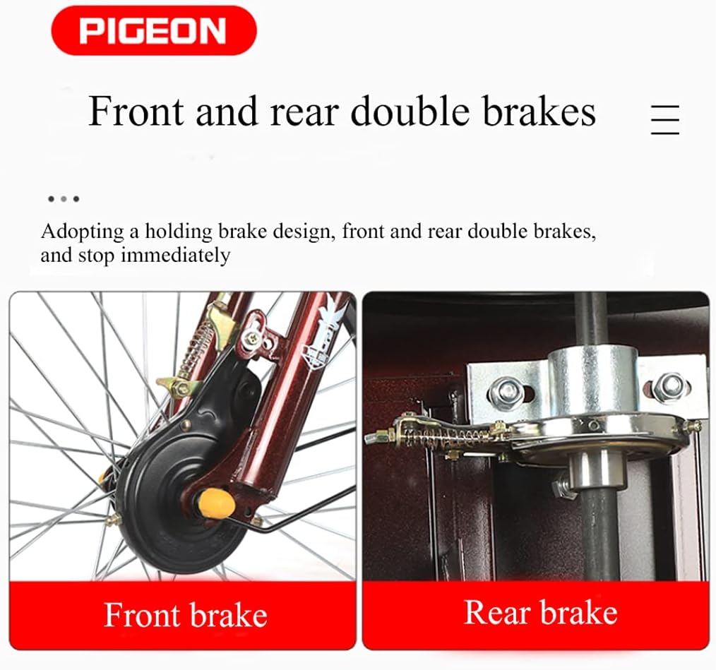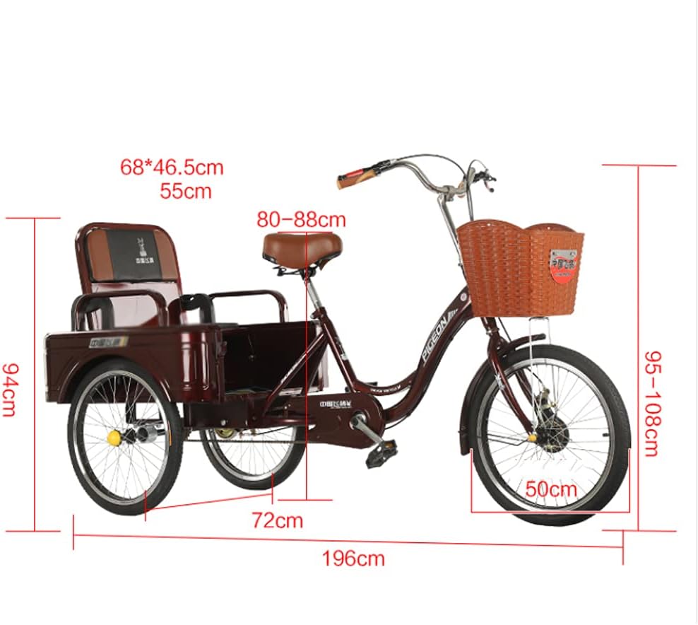 This tricycle will be a practical tool in your daily life. It can be used for entertainment, shopping or exercise. You no longer need to worry about riding while you have nowhere to carry your belongings. You can ride safely and comfortably on town streets, beaches or bike lanes; Features:The tires are non - slip and wear - resistant and have a long service life.The all - enclosed sealed chain cover prevents foreign objects from getting involved, and does not roll the trouser legs to eliminate potential safety hazards.It adopts the design of holding brake, and the front and rear double brakes can stop immediately.Adjustable handlebar provides a stable and balanced ride, upgraded bike saddle/seat is wider and adjustable; both front and rear fenders.The low step - through steel frame allows for easy access for elderly or children with max load weight of 350 pounds.Specification:Name: Elderly TricycleChain: Steel chainFrame: High carbon steel frameRim: 20 - inch aluminum alloy thickened rimHandlebar: Electroplated carbon steel handlebarSaddle: Thick and comfortable saddleBrake: special brake for tricycle with built - in bearingFork: High carbon steel forkFlywheel: 18T (teeth)Crankset: 32T CranksetPedals: high wear - resistant non - slip pedalsFront hub: High carbon steel hubRear hub: high - carbon steel hub with built - in bearingPackage includes1 x 3 Wheels Bike