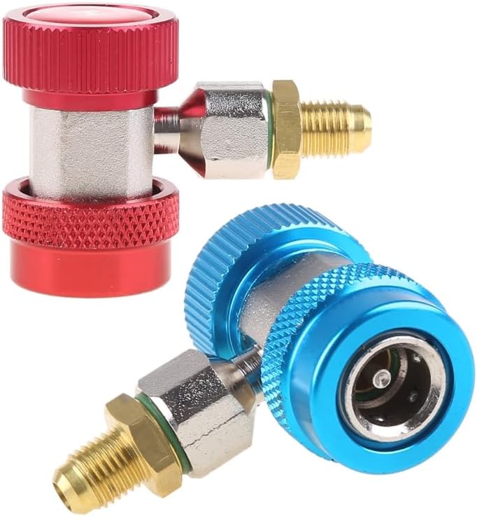 Features:100% high quality and brand newH / L quick couplings adaptersSide mounting for A / C set of manometers (R-134A) typeHigh (Red) & low (Blue) setsPearl nickel platedSize:Height:46mm/1.81"Thread: 1/4"No retail packagePackage Includes:2 Pcs x Quick Hitch R134A