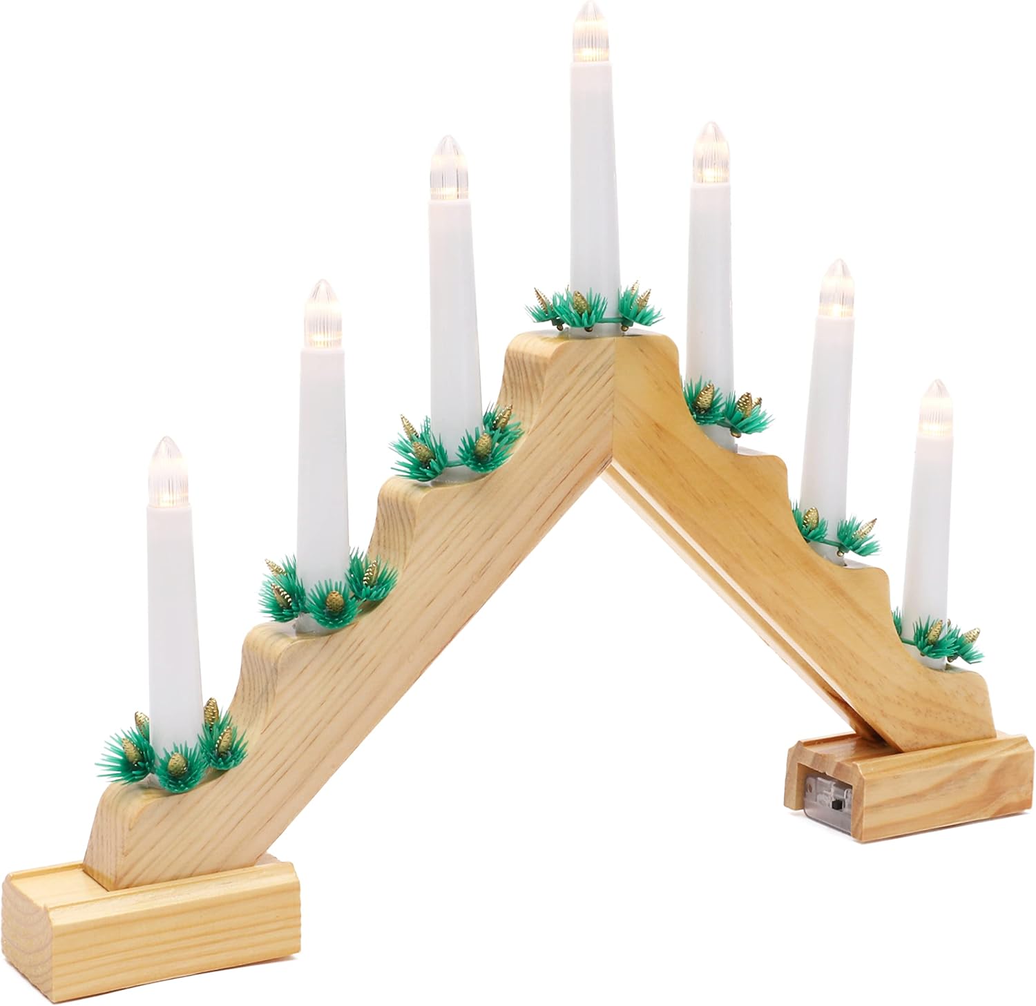 This traditional decoration has been updated with LED lights. LED are very bright, low voltage and energy efficient. The bulbs are warm white led. Warm white is like a fairy light colour. It is more of a soft white than ice white. Would look great in the window or on the fireplace! It is battery operated so no trailing wires.