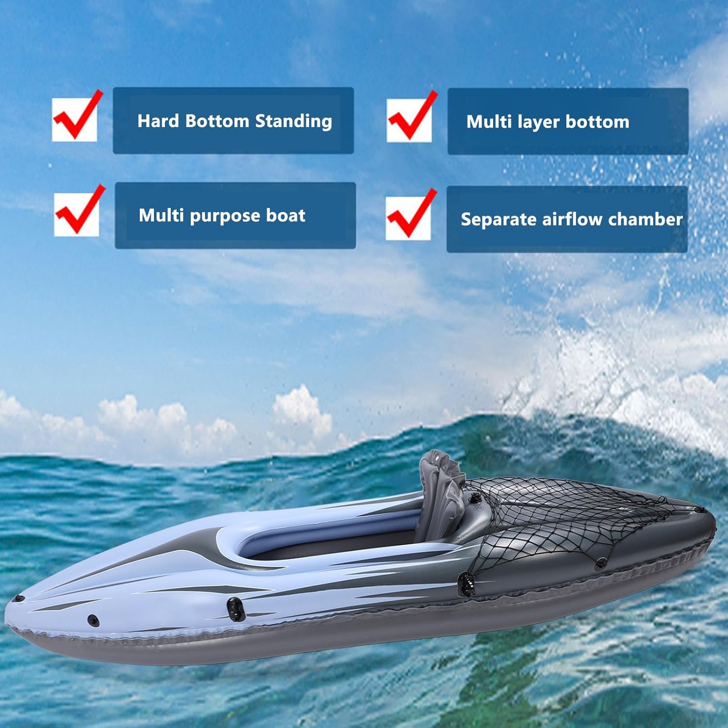 [Uv Protection] Specially treated coating resists uv erosion, preserving vibrant colors even after prolonged sunlight exposure, extending the canoe's lifespan. [Portable Design] The blow-up canoe is foldable for easy carrying and storage, featuring a hard bottom for stability whether fishing seated or standing. [Enhanced Stability] The inflatable kayak is crafted from thickened pvc material, offering wear-proof performance and stability for a safer water adventure. [Water Resistant] The material prevents water seepage, keeping the interior dry, promoting a comfortable user experience. [ Construction] Equipped with reinforced multi-layer hull bottoms for increased load-bearing capacity and abrasion , ensuring a safe return even if one chamber is damaged. Spec: Item Type: Inflatable Kayak Set Material: PVC Inflated Length: Approx. 274cm/107.9in Package List: 1 x Kayak 1 x Kayak Rear Guard Cloth 1 x Inflatable Cushion 1 x Large Repair Patch 1 x Rope 2 x Paddle Blade 3 x Paddle Shaft 6 x Paddle Nut 2 x Paddle Connecting Tube 1 x Hand Pump 1 x Hand Pump Hose 1 x Ruler 2 x Round Repair Patch 2 x Small Plastic Tube 2 x Square Repair Sticker 1 x Instruction Manual 1 x Storage Bag