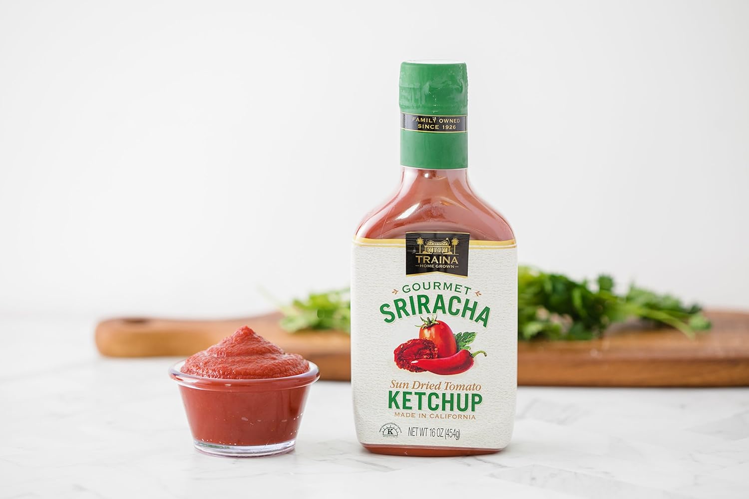 Enjoy Traina Home Grown Gourmet Sriracha Ketchup 6 pack of 16 oz bottles. Enjoy this bold, sriracha ketchup for an added spicy kick. Enhance the flavor of your sauces, burgers, sandwiches, meat and more. Home Grown quality.