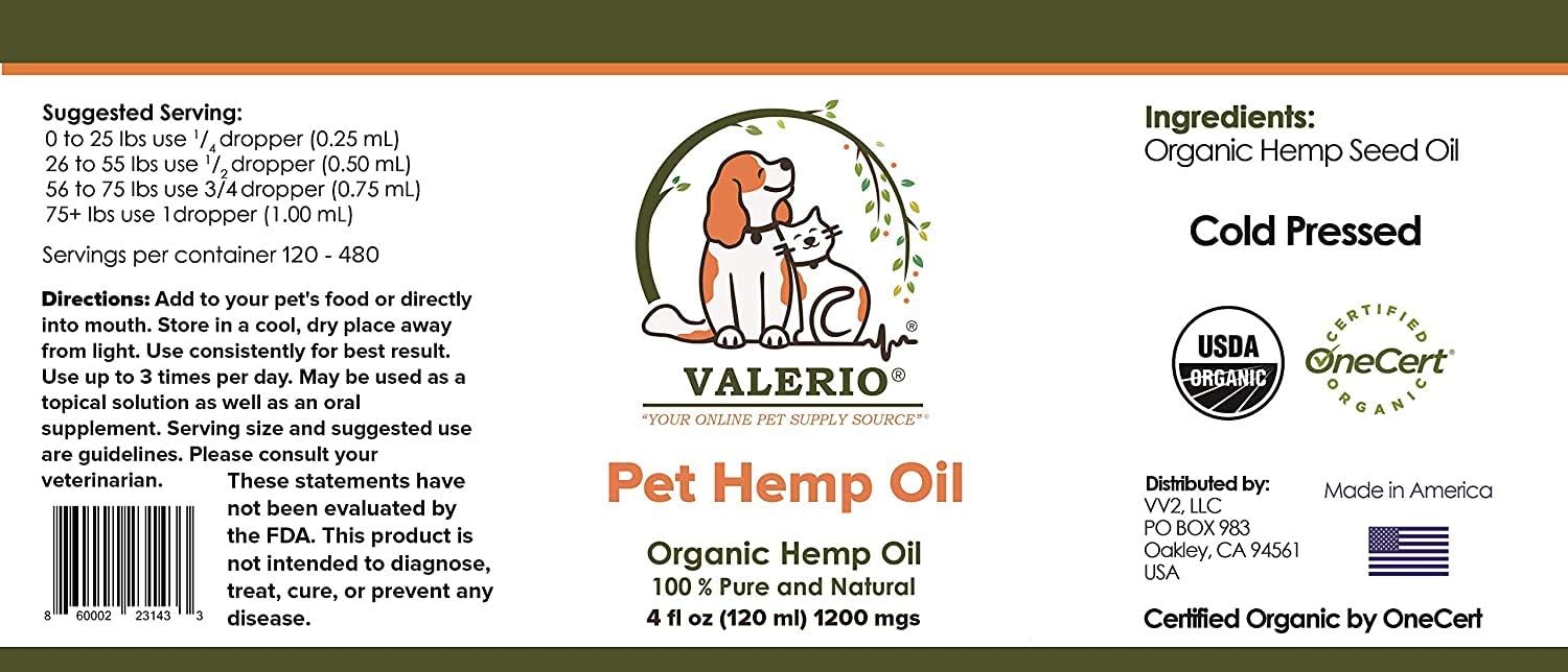 VALERIO PET HEMP OIL - See all the benefits of an all natural remedy, Organic Hemp Oil. Hemp oil offers an excellent balance of amino essential fatty acids, and Vitamin E . It's a fine source of Omega 3, 6, and 9 . It also has GLA and steridonic acid. Not only will it help your dog or cat be strong and happy into mature age . Your pet deserves an All-natural, Organic, Solution Here is what you get with Valerio Pet Hemp Oil: Organic Pet Hemp Oil Cold pressed, Vegan, Non - GMO hemp seed oil Peace of mind of knowing exactly what you are feeding your dogs and cats; 100% Pure Pet Hemp Oil 300 mg of hemp oil for dogs and cat A product free of masked fragrance, additives, preservatives, flavors and other "filler" ingredients Administering Methods: Use as an oral supplement to promote health . Use as topical solution to reduce discomfort on the skin Add to your pet food, dog treats, cat treats, or administer directly into their mouth Patience is a virtue To get the most value out of your product, administering the oil daily is essential, like a multi-vitamin. Many natural products work gradually, so I recommend giving it time to get the full effect. So don't give up in case you haven't seen a big difference yet! Many customers love Valerio Pet Hemp oil so much they return to buy more. HURRY. These make a much appreciated gift for friends, family, and co-workers - anyone with a pet