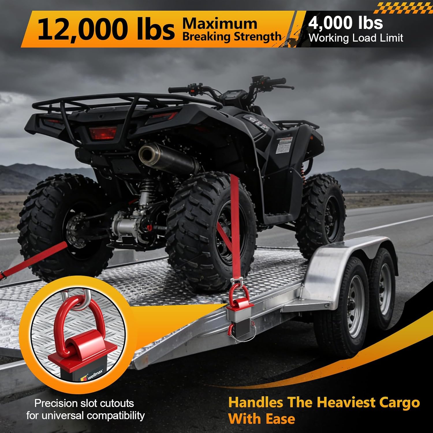 Transform your flatbed, utility trailer, or car hauler into a heavy-duty hauling machine. The Wellmax Stake Pocket D-Ring 4-Pack gives you flexible, rock-solid tie-down points exactly where you need them without the hassle of welding or drilling. Instant, Adjustable Tie-Downs Stop struggling with factory anchors that are in the wrong spot or sit loosely in your trailer pockets. These drop-in stake pocket D-rings feature 4 distinct pin holes along the shaft, allowing you to customize the installation height. This guarantees a snug, rattle-free fit across different pocket depths. Simply slide them in, choose your pin hole, insert the included tethered hitch pin, and you are ready to secure your load. Engineered for the Heaviest Loads Built for landscapers, contractors, and off-road enthusiasts, these 1/2-inch solid steel anchors boast a massive 12,000 LBS Minimum Breaking Strength. Whether you are locking down a mini excavator with chain binders or strapping a UTV with ratchet straps, these anchors handle the tension without bending. Weather-Defying Durability Treated with a rugged E-coating, these anchors shrug off rain, mud, and road salt to prevent rust. The bold red D-ring not only looks great on your rig but provides high visibility when working in low-light conditions. What’s Included (4) 1/2" D-Ring Stake Pocket Anchors (Red) (4) 1/2" Hitch Pins with Anti-Loss Steel Wire (4) Cotter Pins